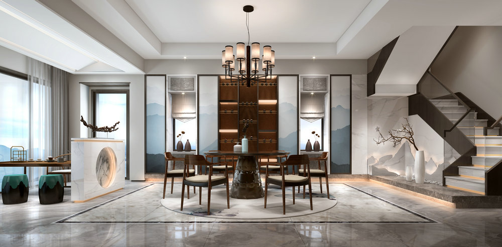 峨眉山與湖六室三衛320平米現代新中式客廳