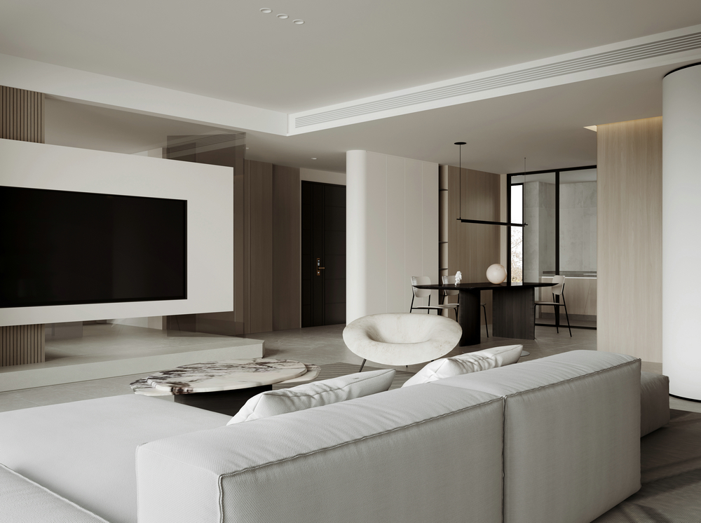 空間感:本案打開了陽臺區域,融入進客廳空間,擴大客廳延伸感,利用玻璃材質替換電視背景墻隔斷,使整體空間更加通透不厚重,極簡的“空”也恰到好處的體現到空間上。