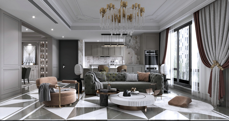成都后花園380平法式風格設(shè)計是成都魯班裝飾公司無同高端設(shè)計部田甜老師設(shè)計,精致優(yōu)雅是女主人對家的期許,此設(shè)計巧妙融合法式浪漫與現(xiàn)代時尚,彰顯奢華與溫馨的完美結(jié)合。灰色沙發(fā)與金色咖啡桌相映成趣,抱枕與毯子增添一抹溫暖。白色茶幾上的裝飾品精巧別致,地板的黑白方格圖案更添時尚感。深紅色窗簾與窗外的綠意相映生輝,營造出浪漫優(yōu)雅的氛圍。角落的吧臺區(qū),兼具實用與美觀,是品酒聊天的絕佳場所。整體設(shè)計獨特而富有創(chuàng)意,讓人仿佛置身于法式奢華的夢境之中。