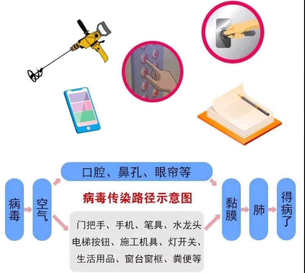 2、間接傳染:帶毒空氣中的病毒落在門把手、手機(jī)、筆具、電梯按鈕、施工機(jī)具等物體上,其他人用手接觸了這些物體,病毒就通過揉眼睛、捂嘴、挖鼻孔等方式進(jìn)入到黏膜內(nèi),然后進(jìn)入肺部,導(dǎo)致病毒性肺炎。